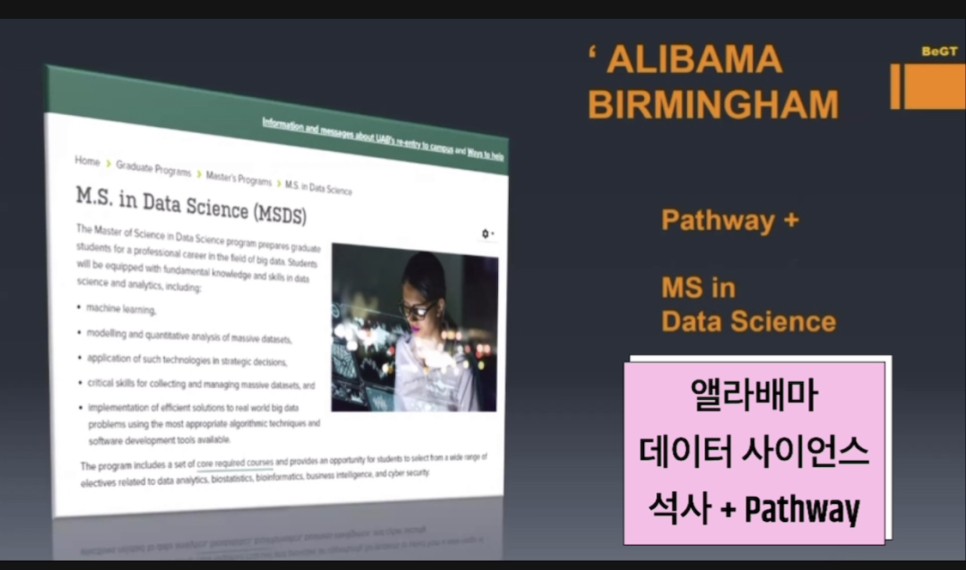 학생들은 한 학기나 3개의 학기로 구성된 패스웨이 프로그램 중에서 자신에게 기간을 선택하고, 패스웨이 조건부 입학 기준을 성공적으로 완료, 필요한 모든 입학 자격 증명을 제출하면 전원 UAB에 입학할 수 있습니다. 전 세계 매우 드물게 비전공자에게 데이터 사이언스 전공 준비과정을 제공하고 있는데요, 정리하면 패스웨이 3학기 + 정규과정 2년으로 구성이 됩니다.