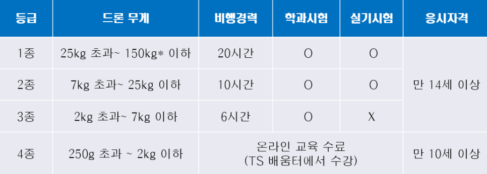 1종~4종 드론 자격증의 종류 *체 중량 150kg 이하 (연료 중량 제외)