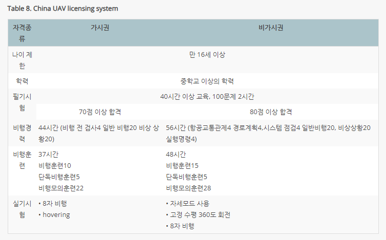 아래는 논문에서 발췌한 중국의 가시권과 비가시권 조종자 자격 종류의 비교 내용입니다. 참고가 될 거 같아서 도표 발췌하였습니다.