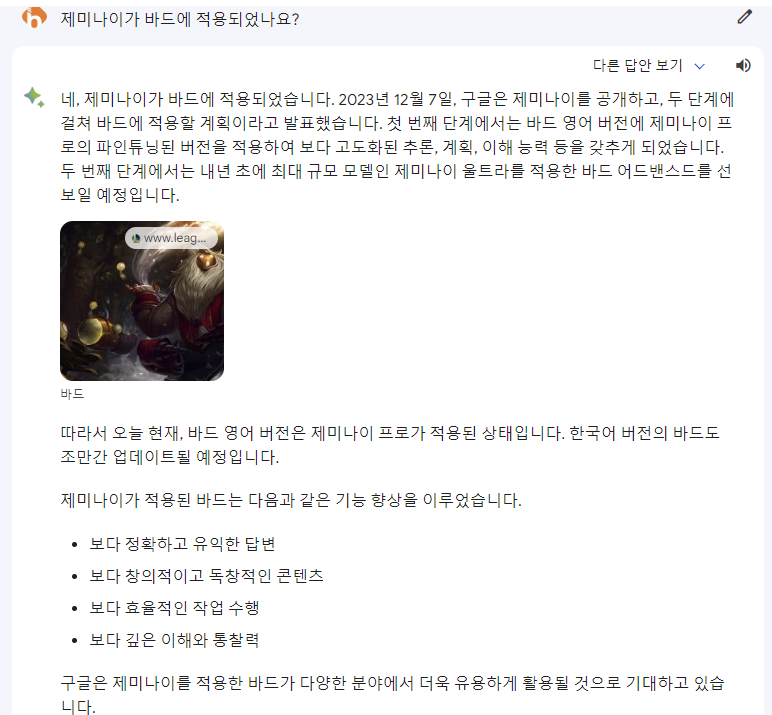 따라서 오늘 현재, 바드 영어 버전은 제미나이 프로가 적용된 상태입니다. 한국어 버전의 바드도 조만간 업데이트될 예정입니다. 제미나이가 적용된 바드는 다음과 같은 기능 향상을 이루었습니다.