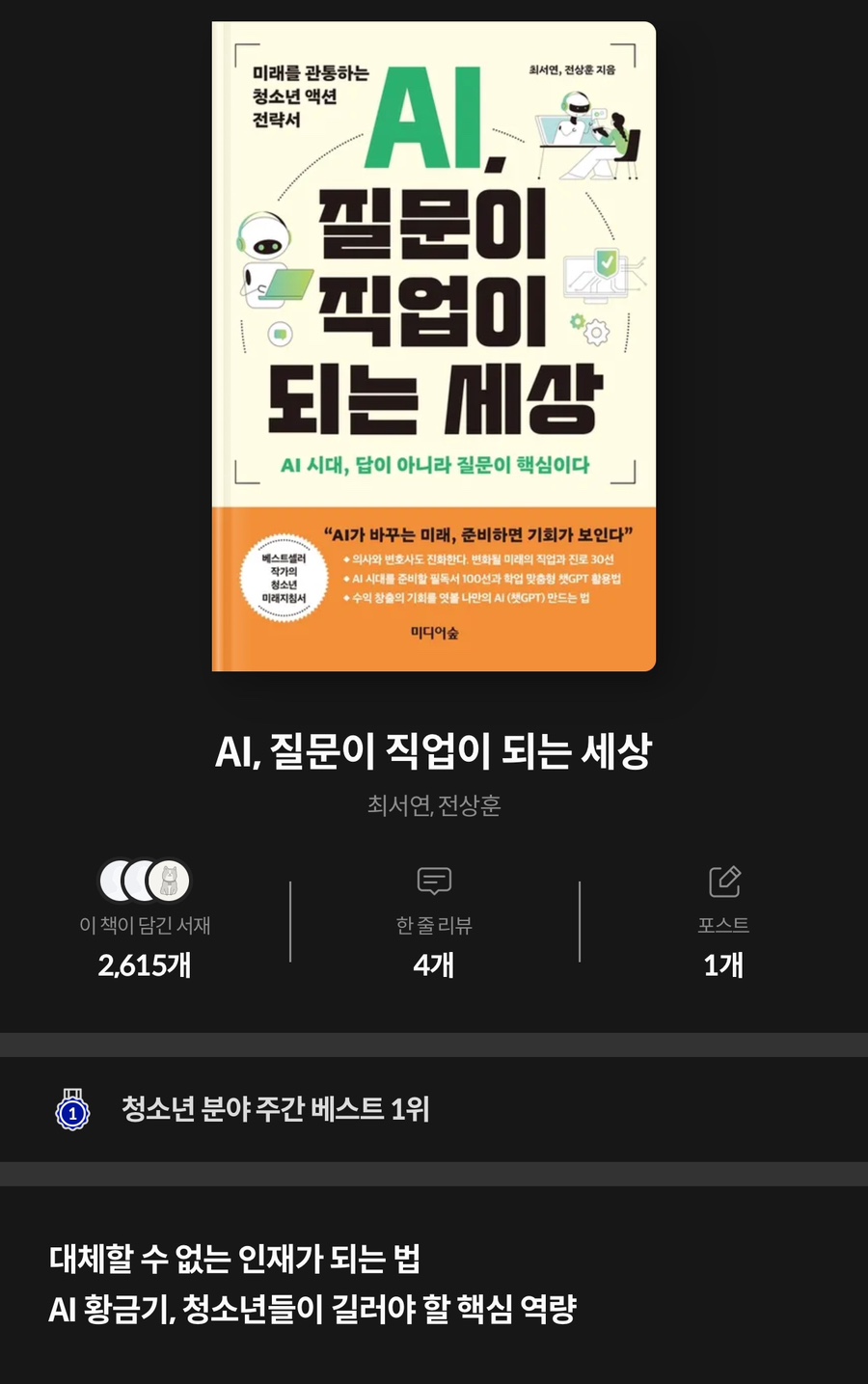 청소년 분야는 20대 여성이 가장 즐겨보는데 이 책은 30대 여성이 많이 보고 있어요 라고 분석 되어 있습니다. 자녀들을 위해 학생들을 위해 학부모나 교사가 관심있게 보고 있을거라 생각합니다. 더하여, 최서연 전상훈 작가는 AI 시대를 준비하는 것은 전 세대들의 숙제이기에 청소년 대상으로 한 전략서이긴 하나 학부모, 교사, 직장인, 공무원 등 성인들 또한 읽을 수 있도록 집필했다고 했습니다.