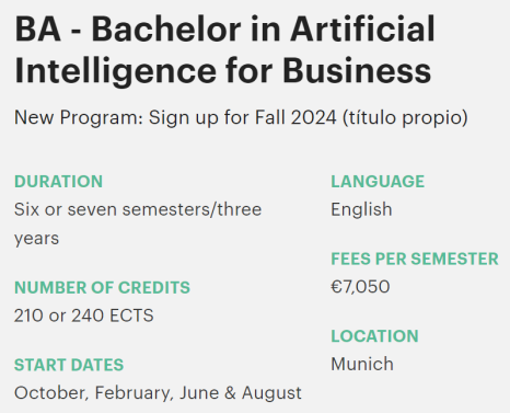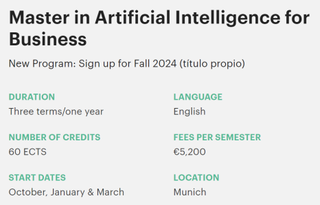 바로 독일의 뮌헨, 스페인의 바르셀로나, 스위스 및 디지털 캠퍼스를 가진 EU 비즈니스 스쿨이 론칭한 새 프로그램 'AI for Busine 학사 및 석사 (비즈니스를 위한 인공지능)' 입니다. 이 과정은 인공지능 기술과 비즈니스 세계에서의 응용에 대한 탄탄한 이해를 제공하도록 설계되었습니다.