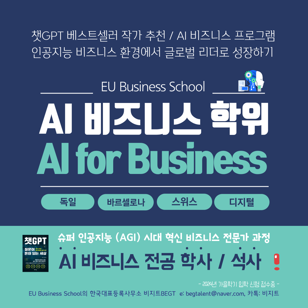 EU Business school 은 인공지능으로 인해 일하는 방식이 바뀌고 비즈니스 환경이 바뀌는 등 기존의 비즈니스 방식이 바뀔 인공지능 시대를 대비할 지식과 통찰력을 기를 수 있는 AI 비즈니스 학사 및 석사 과정을 2024년 가을학기 부터 첫 개강을 시작합니다.