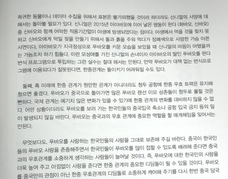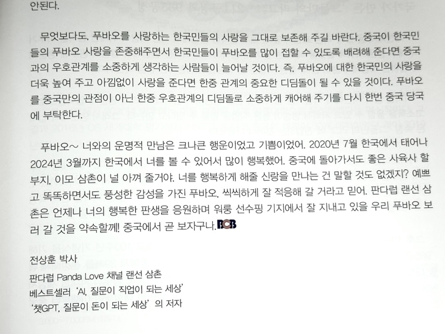 푸바오~ 너와의 운명적 만남은 크나큰 행운이었고 기쁨이었어. 2020년 7월 한국에서 태어나 2024년 3월까지 한국에서 너를 볼 수 있어서 많이 행복했어. 중국에 돌아가서도 좋은 사육사 할부지, 이모 삼촌이 널 아껴 줄거야. 너를 행복하게 해줄 신랑을 만나는 건 말할 것도 없겠지? 예쁘고 똑똑하면서도 풍성한 감성을 가진 푸바오, 씩씩하게 잘 적응해갈거라고 믿어. 판다럽 랜선 삼촌은 언제나 너의 행복한 판생을 응원하며 워룽 선수핑 기지에서 잘 지내고 있을 우리 푸바오 보러 갈 것을 약속할께! 중국에서 곧 보자구나.