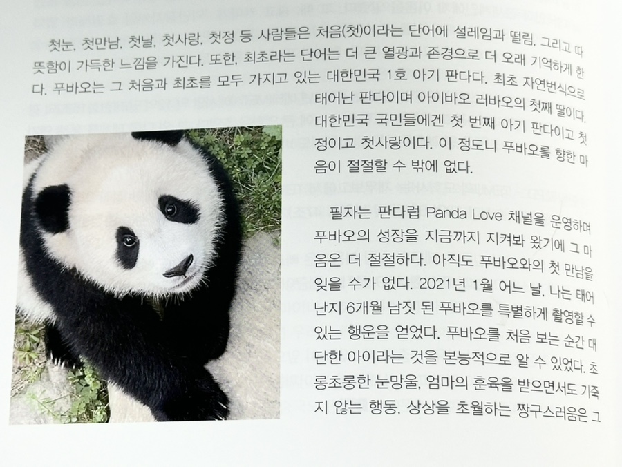 첫눈, 첫만남, 첫날, 첫사랑, 첫정 등 사람들은 처음(첫)이라는 단어에 설레임과 떨림, 그리고 따뜻함이 가득한 느낌을 가진다. 또한, 최초라는 단어는 더 큰 열광과 존경으로 더 오래 기억하게 한다. 푸바오는 그 처음과 최초를 모두 가지고 있는 대한민국 1호 아기 판다다. 최초 자연번식으로 태어난 판다이며 아이바오 러바오의 첫째 딸이다. 대한민국 국민들에겐 첫 번째 아기 판다이고 첫정이고 첫사랑이다. 이 정도니 푸바오를 향한 마음이 절절할 수밖에 없다.