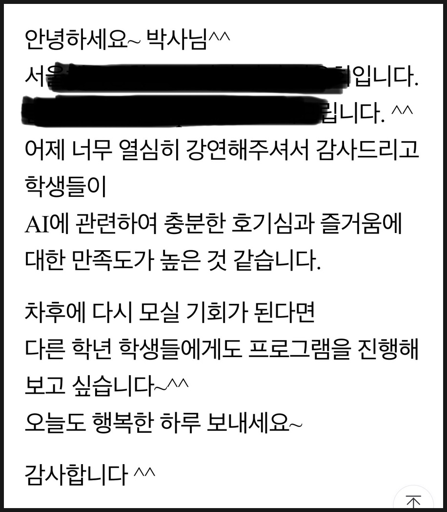 지난 월요일 전상훈 박사는 송파구에 위치한 서울체육중학교를 방문해 'AI시대, 미래인재상과 핵심역량' 이라는 주제로 강연을 하였는데요, 강연 하기 가장 어렵다고 하는 중학생 대상으로 하는 AI, 챗GPT 강연이었습니다 :-) 이번 강연은 서울 송파강동교육지원청의 주관으로 학교로 찾아가는 인문 독서 프로그램의 일환으로 강연을 신청한 학교 중 한 곳인 서울체중에서 운동으로 스마트한 경험 데이터를 가지고 있는 아이들과 인공지능에 대한 통찰력을 공유하는 매우 소중한 시간이었습니다.