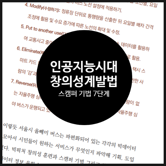 최서연 전상훈 작가의 청소년 AI 인문서 'AI, 질문이 직업이 되는 세상'에서 청소년들이 새로운 것을 창출해 나가는 방법, 깊이 있고 비판적 사고력 향상시킬 수 있는 방법으로 스캠퍼 기법을 소개하였습니다. 이 스캠퍼 기법 7단계을 훈련하다보면 흩어진 정보를 융합하고 다각도적인 시각을 가지게 되어 새로운 것들이 창출되는 과정을 확인하게 될 것입니다.