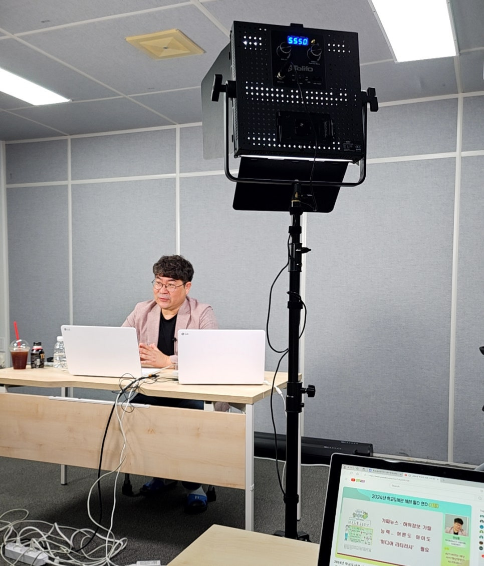 PD님과 담당 교육청 주무관님 그리고 독서교육지원본부 프로그램 담당자와의 콜라보 속에서 3시간 가까이 강연이 진행되었습니다. 유튜브 라이브 방송으로는 오랜만의 강연이라 살짝 긴장이 되기도 했지만 참여하신 사서 교사들의 적극적인 호응으로 무사히 마칠수가 있었습니다. 아래 사진은 라이브하는 장면을 담당 주무관님께서 찍어주신 모습입니다.