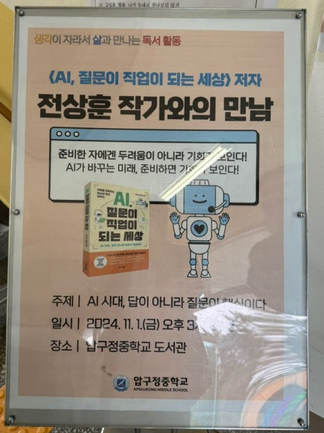 지난주 중학생을 대상으로 특강 시간을 가졌습니다. 올해 'AI, 질문이 직업이 되는 세상' 출간을 하자마자 바로 전화를 주셔서 책 출간 후 1등으로 강연 요청을 한 학교가 압구정 중학교입니다. 2월에서 10월까지 시간을 거쳐 선생님들도 만나 뵙고 학생들도 만나게 되었습니다.