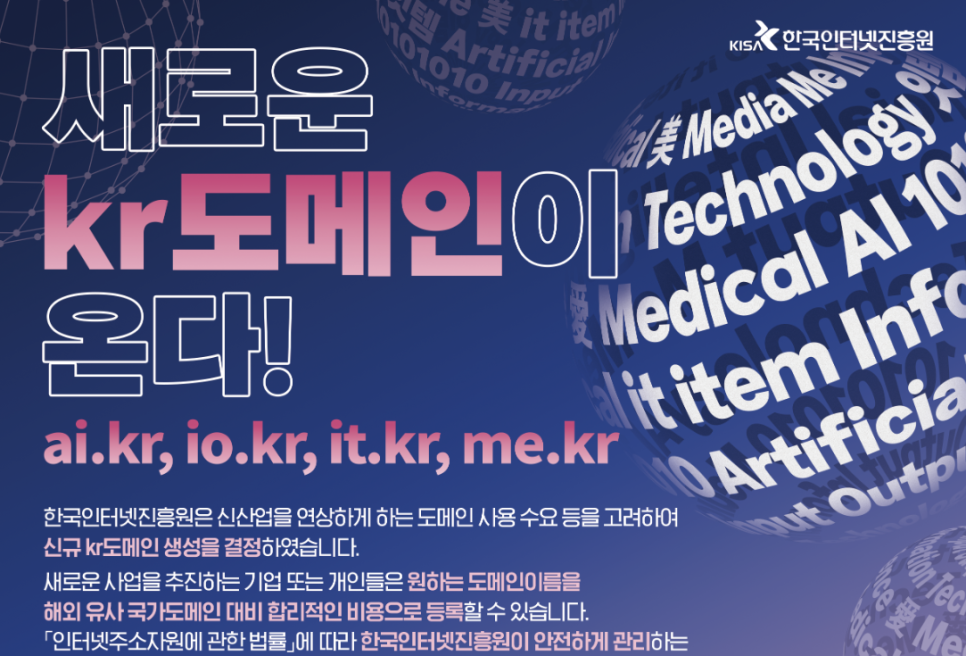 한국인터넷진흥원은 「인터넷주소자원에 관한 법률」에 따라 대한민국의 국가 도메인 ‘.kr’, ‘.한국’을 관리하고 있죠. 최근 해외 국가 도메인인 ‘.ai(앵귈라)’, ‘.io(영국령 인도양 지역)’, ‘.it(이탈리아)’, ‘.me(몬테네그로)’가 AI 분야, 스타트업, IT기업, 블로거들 사이에서 활발히 사용됨에 따라, 국내에서도 트렌드를 따라 도입했다 밝히고 있습니다.