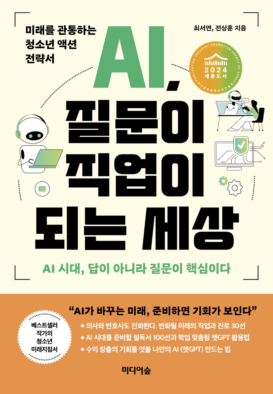이번 세종도서로 선정이 된 'AI 질문이 직업이 되는 세상' 을 통해서 우리 청소년들이 AI 시대를 당당히 맞서 준비할 수 있는 인문 소양서와 미래 진로 탐색서가 되길 기대합니다.