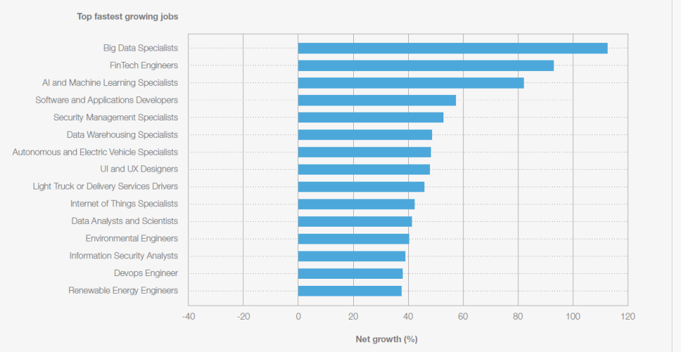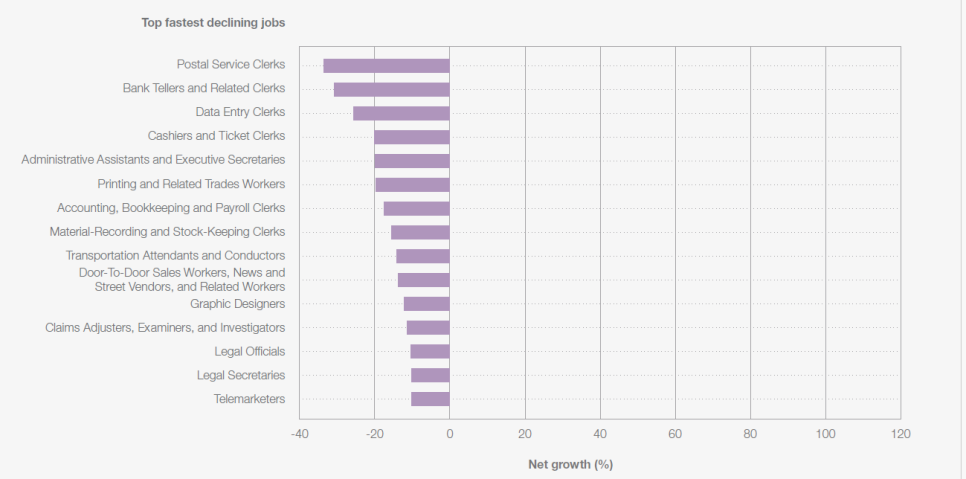 인공지능 기술로 앞으로 5년 동안 새로운 일자리가 1억 7천만개 (현 고용시장의 14%)가 생기지만 현 고용시장의 약 8%에 해당하는 9천 200 만개는 사라질 것이란 전망이 나왔습니다 .즉, 순수 7,800 만개 (현 고용시장의 7%)의 일자리가 창출된다는 것이죠. 또한, 5년 후인 2030년까지 전 세계 일자리의 22% 가량의 변동이 생길 것이라고 내다봤습니다.