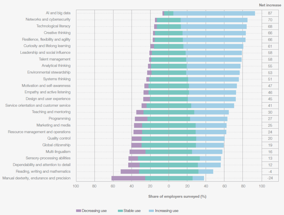 위 표와 사진에서 에서 보는 것처럼, 빅데이터 분석과 머신러닝을 비롯해 창의적 문제해결력, 디지털 커뮤니케이션 역량 등이 강조됩니다. 반면, AI와 자동화가 대체 가능한 단순·반복 업무나 규칙 기반의 데이터 처리 역량은 중요성이 점차 줄어들 것으로 전망하고 있습니다.