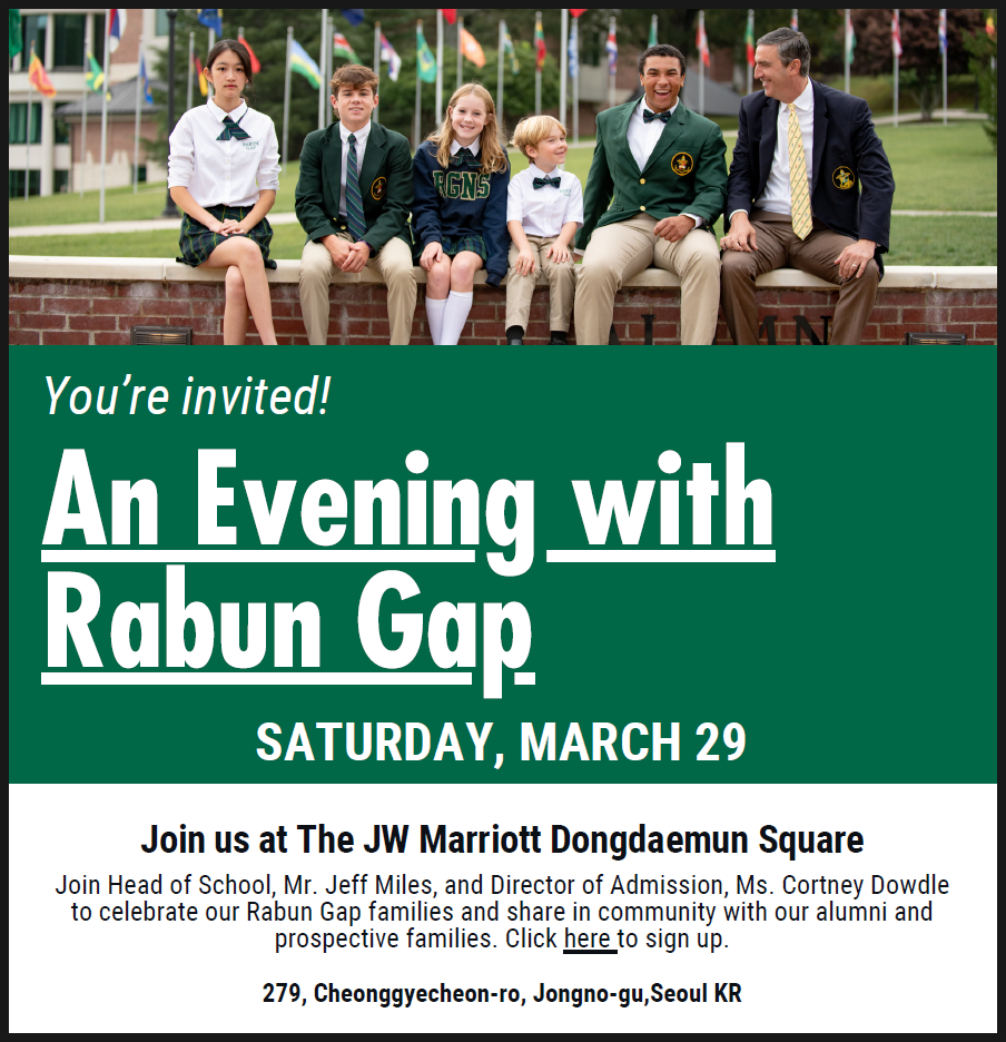 2025년을 맞아 레이번 갭에서 올 3월 한국에서 특별한 행사를 진행합니다. 3월 29일 오후 6시부터 졸업생, 현재 재학 중인 학생의 학부모와 그리고 레이번갭에 관심이 있는 학생들의 학부모를 모시는 자리를 마련하게 되었습니다. Rabun Gap의 리더십, 운동 및 예술 등에 기여한 모든 훌륭한 학생들과 그들의 기여에 감사하는 자리를 표할 것으로 보입니다.