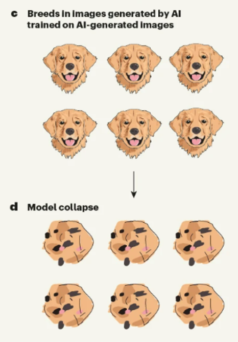 개 이미지를 생성하는 AI를 예시로 설명해 보겠습니다. AI가 골든 리트리버, 불독 등 다양한 종류의 개 이미지를 학습하는 상황에서 만약 골든 리트리버 이미지 데이터가 다른 견종에 비해 압도적으로 많다면, AI는 골든 리트리버에 대한 학습이 과도하게 이루어질 것입니다. 이러한 학습이 반복되면 AI는 ‘개’ 하면 오직 ‘골든 리트리버’만을 떠올리는 편향된 인식을 갖게 됩니다. 더욱 심각한 문제는 여기서 그치지 않습니다. AI가 생성한 이미지를 학습한 AI는 결과적으로 골든 리트리버조차 제대로 표현하지 못하고 이상한 이미지를 생성하게 됩니다.