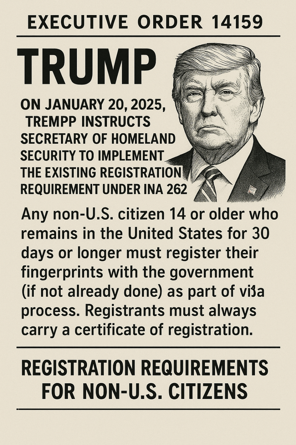 2025년 1월 20일, 트럼프 대통령은 국토안보부가 이민국적법(INA) 262조에 따라 기존 등록 요건을 시행하도록 지시하는 행정 명령 14159호를 발표했습니다. 이 법은 미국에 30일 이상 체류하는 14세 이상의 모든 비미국 시민권자는 정부에 지문 등록을 해야 합니다 (비자 절차의 일환으로 이미 하지 않은 경우). 항상 등록 증명서를 휴대해야 합니다.
