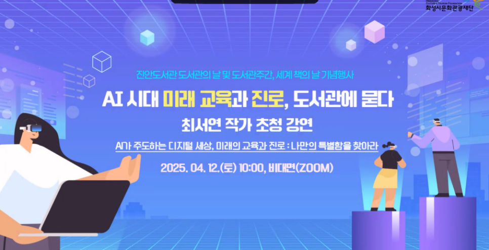 최서연 박사는 화성 진안 도서관에서 학부모, 교사 등 성인을 대상으로 하는 강연을 마쳤습니다. 이 특강은 지난 4월 도서관의 날을 맞아 진행된 강연으로 AI 시대 미래 교육과 진로 전략을 구상해 보는 시간으로 불확실하고 모호한 디지털 세상 속에 당당히 자신만의 길을 만들어 가려는 청소년과 미래 경쟁력을 갖춘 자녀로 성장시키기 위한 학부모, 교사들을 대상으로 한 특강이었습니다.
