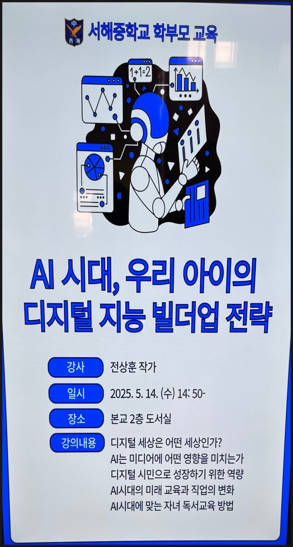 전상훈 박사는 지난 주 시흥에 위치한 서해 중학교에서 학부모 대상으로 'AI시대, 우리아이 디지털 지능 빌더업 전략' 이라는 주제로 강연을 진행했습니다. 이번 강연에서 지브리 스타일 열풍 이후 챗GPT와 생성형 AI를 모르는 분들은 없지만 그만큼 AI가 활용이 늘어나면서 AI의 할루시네이션과 해킹 리워드(거짓말이나 더욱 자극적인 표현과 결과값으로 인간의 보상을 끌어내는것)의 강화가 되고 있음과 이런 현상으로 인해 이제는 AI를 잘 활용하는 것보다 얼마나 올바르게 활용하는 것이 더 중요함을 설명했습니다.