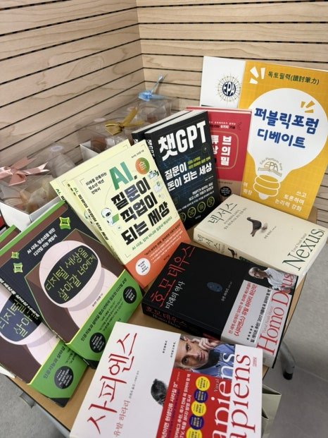 사피엔스, 호모데우스. 넥서스와 전상훈 박사의 저서 및 허향숙 대표의 디베이트 교재 등 전시