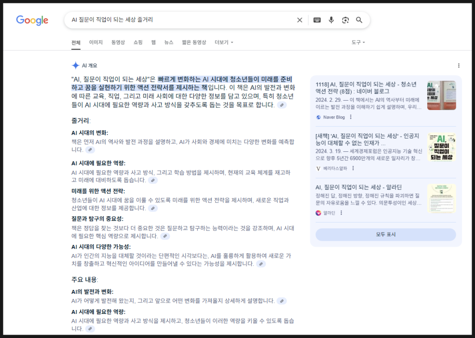 이미 구글은 AI 오버뷰로 구글에서 검색을 하면 화면 최상단에 AI의 대답을 바로 볼 수 있습니다. AI 질문이 직업이 되는 세상 줄거리라고 입력하자 AI가 가 주요 내용을 볼드로, 그리고 줄거리와 핵심 내용들을 잘 정리해 주고 오른쪽에 관련 출처들을 나열해 주고 있습니다.