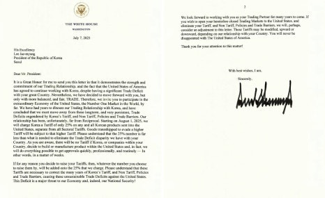 현지시간 2025년 7월 7일, 도널드 트럼프 미국 대통령이 자신의 Truth Social 계정에 한국과 일본의 대통령과 총리에게 보낸 관세 통보 서한의 원본 이미지를 공개되었는데요, 8월 1일부터 한국·일본산 모든 제품에 25% 관세를 부과하겠다는 것입니다. 이 조치는 기존 품목별 관세와 별도로 적용되며, 우회 수출 제품도 예외 없이 포함됩니다.