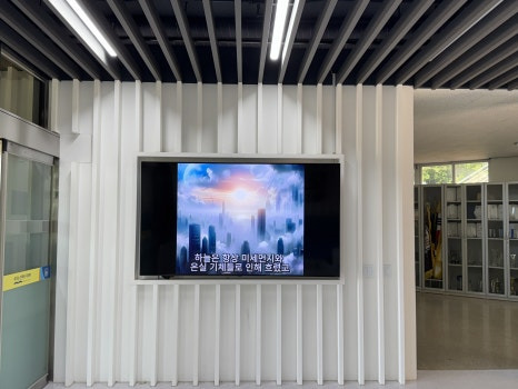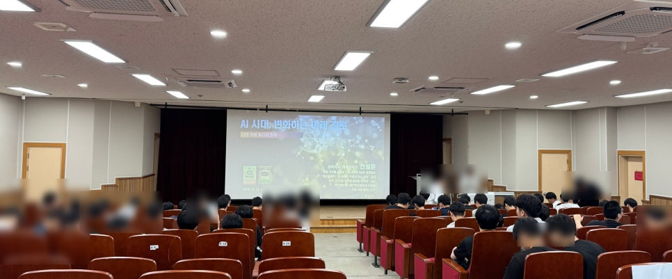 지난주 인천 계산 고등학교에서 진행했던 특강 소식을 전해 드리려고 합니다. 이번 강연은 'AI 질문이 직업이 되는 세상'을 읽으신 학생들의 미래의 진로에 대해서 특별한 관심을 가지고 계신 사서 선생님의 특강 요청에서 시작되었는데요, 계산고 1층 현관에는 ESG에 관련된 비디오가 재생되고 있더군요. ESG, AI 등 미래에 대한 준비를 철저히 하고 있는 학교라는 생각이 들더군요.