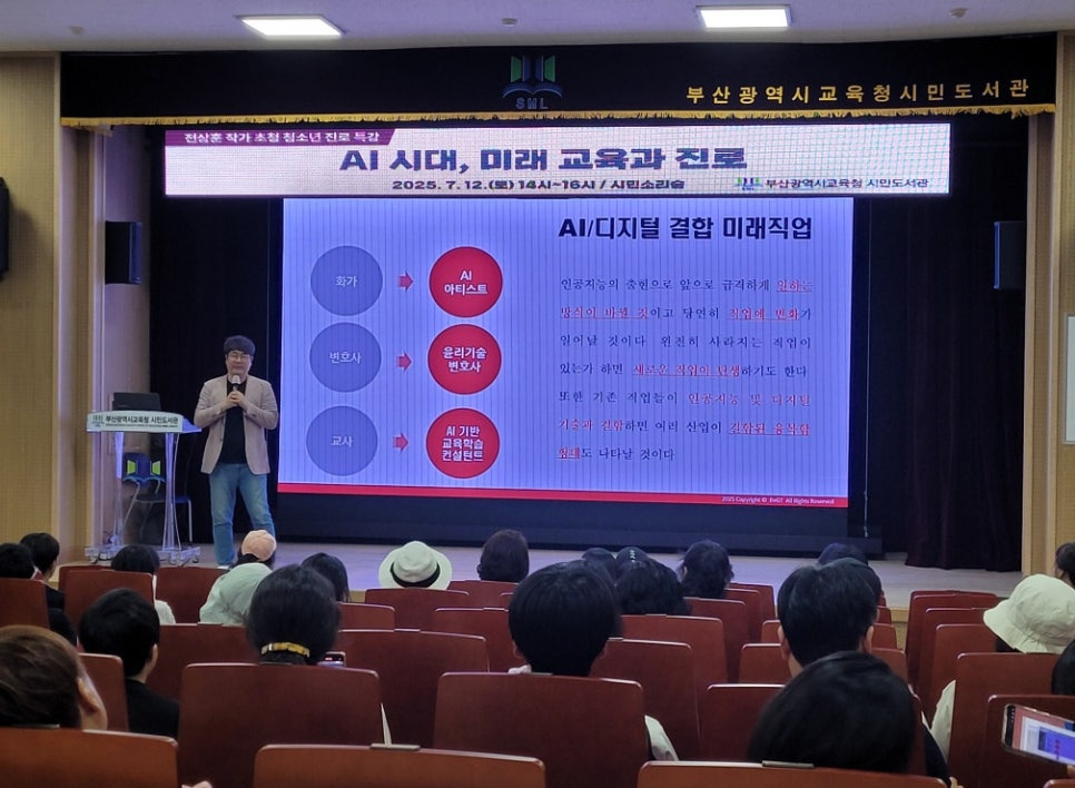 이번 강연을 통해 부산 지역 청소년들과 학부모들에게 AI 시대를 준비할 수 있는 계기가 되길 바라며, 자신만이 만들어갈 근사한 미래를 응원합니다!! 이렇게 의미 있는 특강을 준비해 주신 부산시민도서관 관계자분들께도 진심으로 감사드립니다.