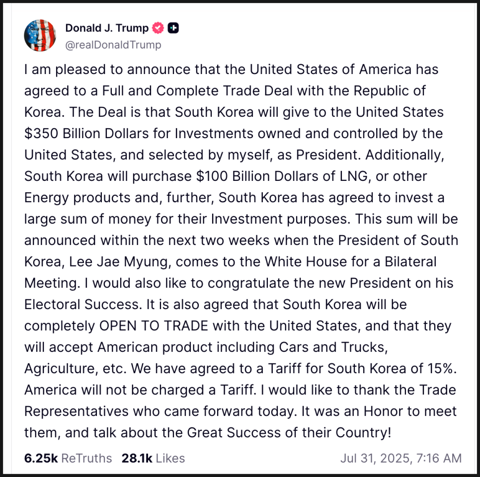 트럼프가 소셜 미디어 트루스를 통해 한국과의 관세 협상 타결 내용을 전한 전면 내용은 아래와 같습니다.