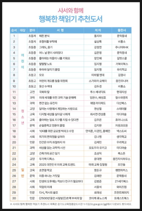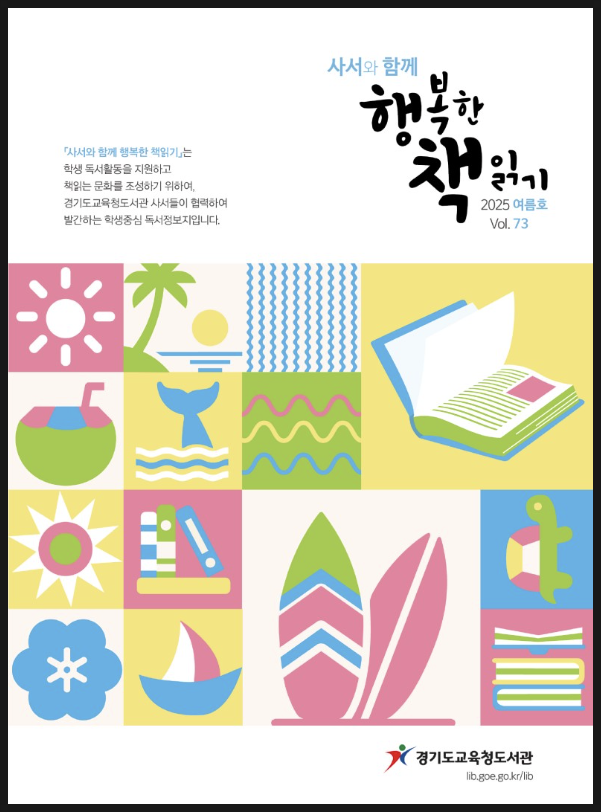 독서 정보지인 '사서와 함께 행복한 책읽기' 는 학생 독서 활동을 지원하고 책 읽는 문화를 조성하기 위하여 경기도교육청 도서관 사서들이 협력하여 발간하는 학생 중심 독서 정보지입니다. 지난 2025 봄호에 이어 이번 여름호가 나왔는데요, 여름방학 동안 학생들이 읽었으면 하는 추천 도서 30선을 내 놓았습니다.