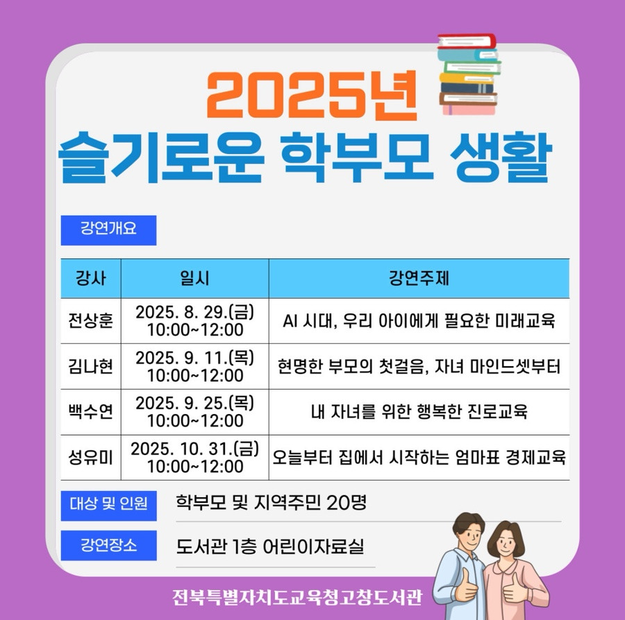 전북특별자치도교육청 고창도서관에서는 2025년 슬기로운 학부모 생활이라는 큰 테마 아래 특강 프로그램을 준비했습니다. 그중에서 전상훈 박사는 오는 8월 29일에 'AI시대, 우리 아이에게 필요한 미래교육' 이라는 주제로 학부모들이 AI 시대를 이해하고 자녀들의 미래를 위한 준비를 할 수 있도록 할 예정입니다.