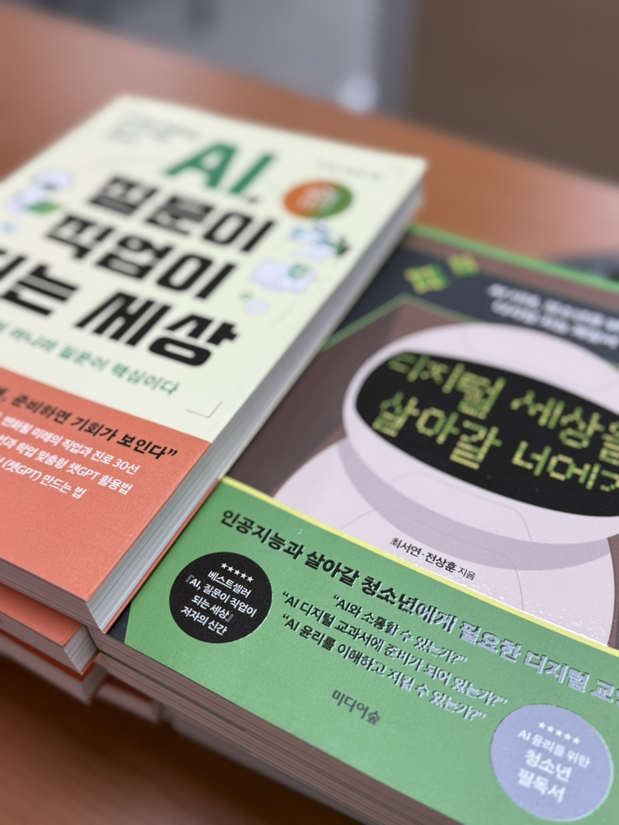 저자 사인을 위한 학교에서 준비해 주신 도서, 'AI 질문이 직업이 되는 세상' 과 디지털 지능 계발서인 '디지털 세상을 살아갈 너에게'