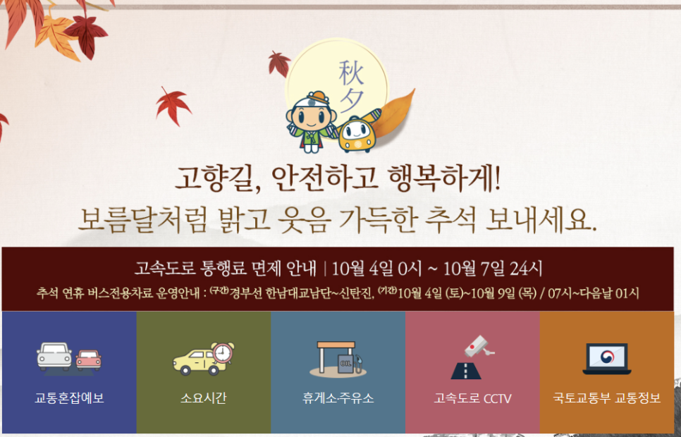 무료 혜택 기간은 10월 4일부터 7일까지입니다. 10월 4일 0시 즉, 10월 3일 11시 59분 59초 지나 4일 0시부터 시작됩니다. 즉, 이 시간부터 톨게이트 진입 시 무료가 됩니다. 마지막 날은 10월 7일 24시까지인데요, 7일 밤 11시 59분 59초까지 진입을 하면 톨게이트 나가는 시간엔 상관이 없이 무료 적용이 됩니다. 7일이 끝나기 전 안전하게 진입하시는 게 좋을 거 같네요. 7일은 아마도 대부분 귀경하실 때 대부분 적용될 가능성이 높은 시간이 될 거 같으니, 일정이 맞물린다면 진입 시간에 문제가 없도록 해야겠습니다.