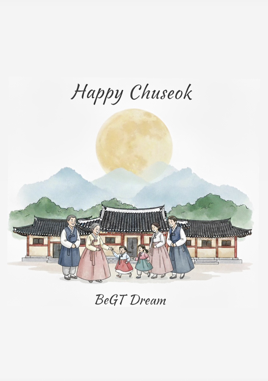 2025 최장기간 추석연휴 계획 잘 세워 알찬 시간 보내시고 가족분들과 친지들 모두 웃음이 넘치는 풍성한 한가위 되시기 바랍니다. 비지트 BeGT 공동대표 전상훈 / 최서연 박사 Dream