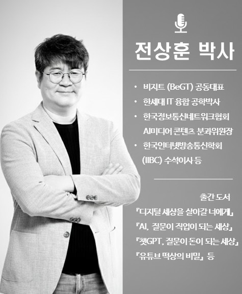'AGI 시대, 꼭 필요한 디지털 문해력'이라는 주제로 진행되는 겨울 프로그램으로 매주 토요일 8주 차 과정입니다. 전상훈 박사는 '유튜브 떡상의 비밀' 알고리즘 파도 타는 9가지 기술이라는 도서 출간을 필두로 베스트셀러 종합 3위, 경제경영 1위 '챗GPT, 질문이 돈이 되는 세상'의 저자이기도 합니다. 유튜브 등 추천 알고리즘 편향성과 권력화에 대한 연구뿐만 아니라, 미래전략가로 활동하며 다양한 분야에서 정보융합 자문을 하고 있습니다.