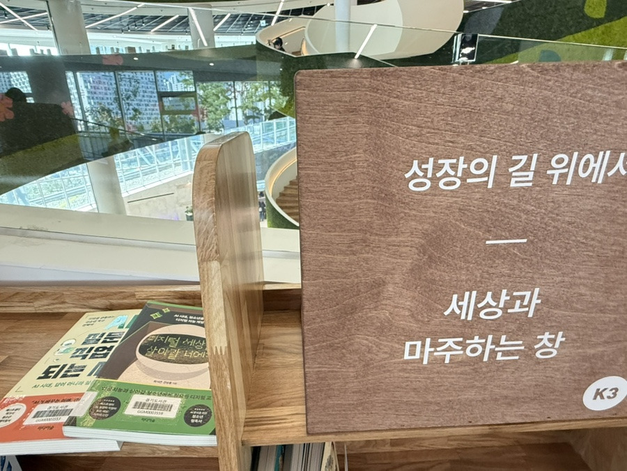 경기책길의 도면인데요, 양 옆으로 책이 테마별로 전시가 되어 있습니다. 경기책길 A 에는 K1 ~ K14 까지, 경기책길 B 에서는 K15~K27 까지로 나눠져 있습니다. 올라가는 길 K3 '성장의 길 위에서 세상과 마주하는 창'에서 비지트의 공동대표인 전상훈 박사와 최서연 박사의 저서 'AI, 질문이 직업이 되는 세상' 과 '디지털 세상을 살아갈 너에게' 가 전시되어 있어 한컷 찰칵 했습니다 :-0