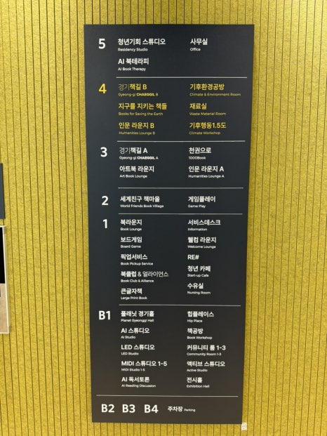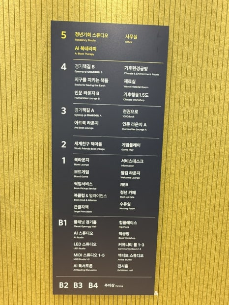 1층: 북라운지, 서비스데스크, 보드게임, 웰컴라운지, 픽업서비스, RE#, 북클럽& 얼라이언스, 청년 카페, 큰글자책, 수유실
