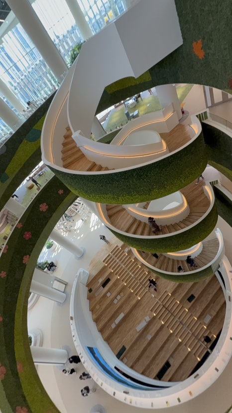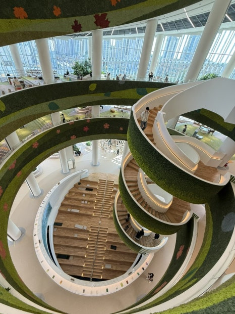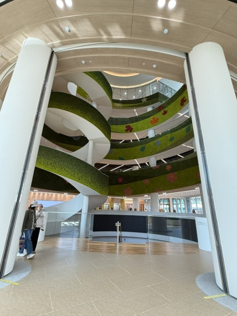 이 외에도 시니어를 위한 큰글자책, 장애인을 위한 보조 도구, 픽업 서비스, AI 독서클럽 등 다양한 프로그램이 진행되는 공간이 마련되어 있었습니다. 1200억 규모의 역대급 규모답게 건물은 매우 웅장하고 컸습니다. 핀란드 헬싱키 중앙 도서관 오디 Oodi 와 비슷한 나선형 계단으로 사뭇 비슷했는데요, 크기에 비해 책은 턱없이 부족해 보였고 기후 환경 등에 포커스를 너무 맞추다보니 도민들의 사용자 경험보다 특화성을 나태내는 섹터나 디스플레이에 신경을 더 많이 쓴 듯했습니다.