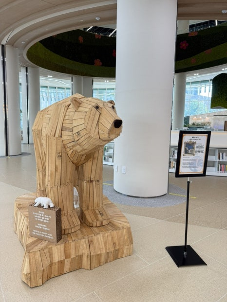지하 1층 중간 계단을 밝고 올라가면 1층이 됩니다. 올라가자 마자 제일 먼저 보이는 것이 바로 나선형 모양, 달팽이 모양의 계단 등 건축물이 눈에 확 뜰어오게 됩니다. 아마 이때 가장 방문객들이 카메라 셔트를 누르는 순간이 아닐까 싶네요. 안내 데스크와 주차 정보 등 기본 안내를 받을 수 있는 곳입니다. 그를 중심으로 양쪽으로 리사이클 된 제품과 환경을 생각할 수 있는 북극곰 등 기후 환경 주제의 도서관 다운 공간을 1층에 열어 두었습니다. 기후 도서관임을 상기시킬 수 있는 공간입니다.