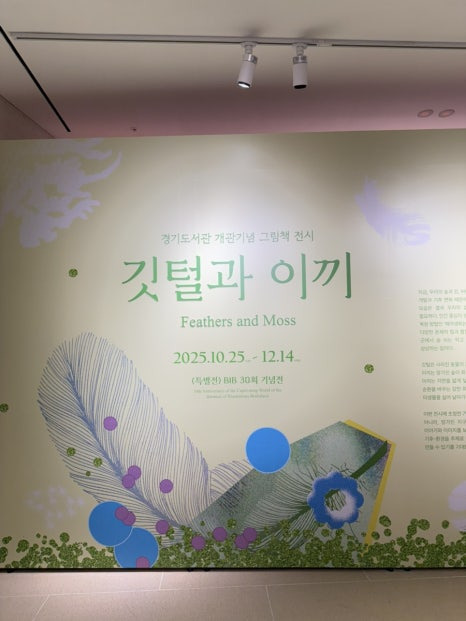 주차를 한 경우는 지하 1층으로 나오면 바로 경기도 도서관으로 연결이 됩니다. 걸어서 조금만 가면 들어가는 문이 보이는데요, 들어서면 그림책 전시가 눈에 들어오는데요, 이번에 개관 기념으로 기획된 깃털과 이끼였습니다. 넓은 전시 공간이 환해서 좋았네요.
