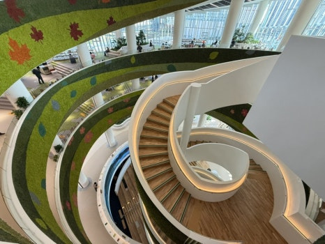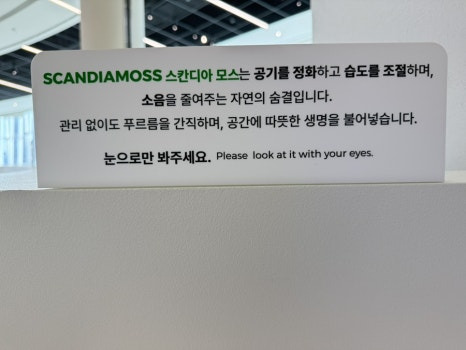 그리고 눈에 들어오는 달팽이 모양 나선형으로 올라가는 계단의 벽면엔 초록 초록인데요, 이는 스칸디아모스로 꾸져졌으며 공기를 정화하고 습도를 조절하며 관리 없이도 푸르름을 간직하며, 공간에 따뜻한 생명을 불어 넣는다고 되어 있다고 친절히 설명하고 있습니다.