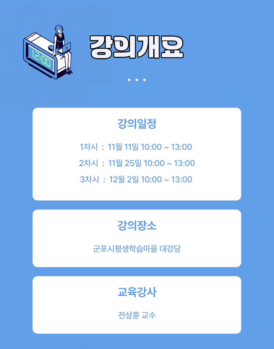 일시: 2025. 11. 11. / 11. 25. / 12. 02. (화) 10:00 ~ 13:00 (총 3회, 회당 3시간)