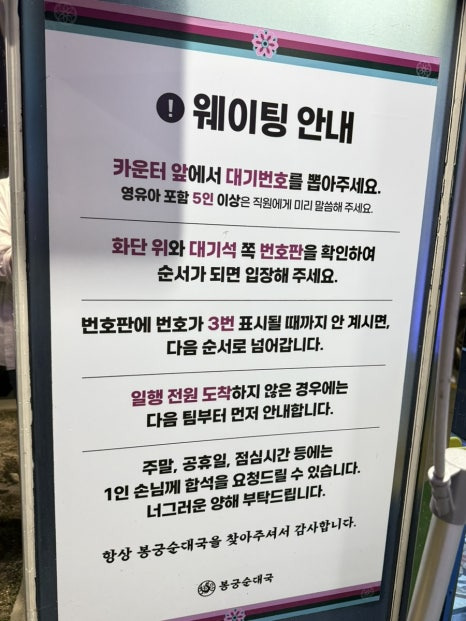 비지트가 도착했을 땐 6시가 되기 전 이어서 그나마 대기 줄 웨이팅이 없는 상황이었어요. 하지만, 봉궁순대국 바로 앞엔 주차할 곳이 없더군요. 조금만 옆으로 지나면 2주차장이 있어서 주차는 문제가 없었습니다. 운 좋게도 들어가서 바로 주문을 할 수 있었습니다. 주문은 보약 시래기와 불꽃 순대국을 주문했습니다.