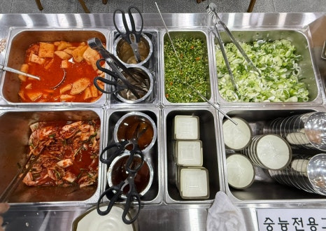 기본 찬으로 깍뚜기와 배추 김치가 나왓는데요, 추가 반찬은 셀프로 진열이 되어 있어 편리했습니다. 특히, 밥은 고슬고슬 맛이 좋아서 두 그릇은 기본으로 먹게 되는데요, 밥은 리필이 가능했고 숭늉까지 준비되어 있어 순대국 먹기 전에 몸 풀기에 좋았습니다.