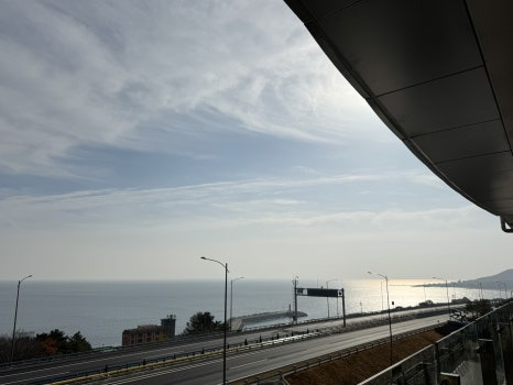 휴게소에 내리자마자 가장 먼저 반겨주는 건 바로 시원하게 펼쳐진 동해 바다입니다. 보통 휴게소는 산이나 논밭 뷰가 많은데, 이곳은 휴게소 자체가 바다 바로 옆 언덕에 위치해 있어서 전망대 못지않은 풍경을 자랑합니다. 날씨가 좋아서 파란 하늘과 바다의 경계가 모호할 정도로 아름다웠어요. 도로를 달리는 차들과 바다가 어우러진 모습이 정말 장관이었습니다.