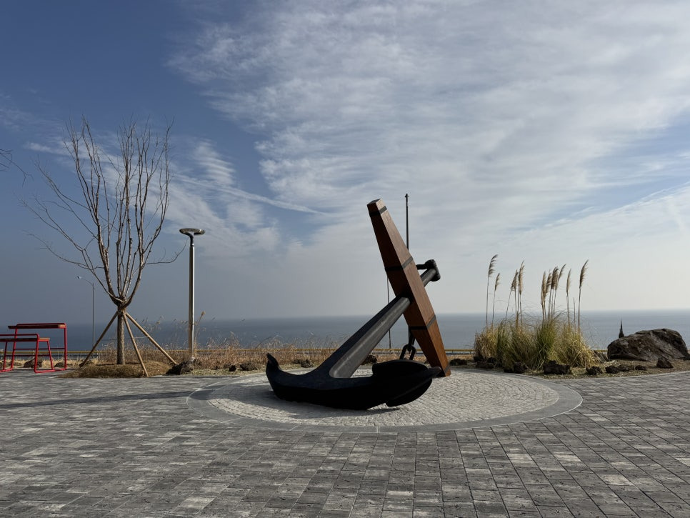 산책로 쪽에는 거대한 닻 모양의 조형물이 설치되어 있어요. 바다의 도시 포항답게 웅장한 느낌을 줍니다. 뒤로 보이는 수평선과 어우러져서 여기서 인증 샷 찍으시는 분들이 많더라고요. 포항 휴게소의 시그니처 포토존이 될 것 같습니다. 오늘 특히 날이 너무 좋아서 사진이 잘 나온 거 같습니다.