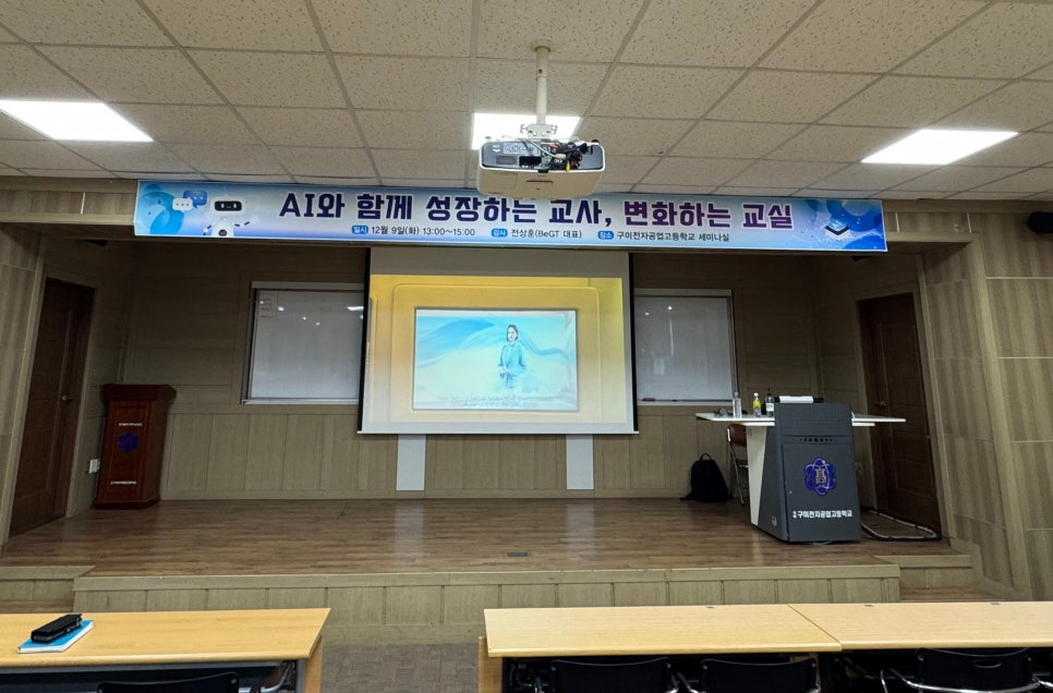 전상훈 박사는 대한민국 마이스터 교육의 심장부라 불리는 국립 구미전자공업고등학교를 방문하여 선생님들을 대상으로 'AI 와 함께 성장하는 교사, 변화하는 교실'을 주제로 생성형 AI 시대의 교실 활용 전략에 대한 특강을 진행했습니다. 교문에 들어서는 순간 세계로, 미래로 도약하는 글로벌 영 마이스터라는 문구는 구미전자공고의 위상을 잘 드러내주었습니다.