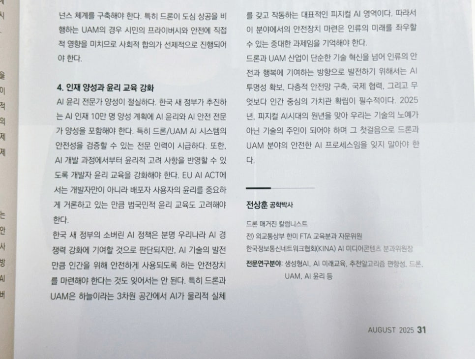 이번 8월호에는 요즘 화두가 되고 있는 소버린 AI 와 피지컬 AI 의 흐름 속에 드론의 위치는 어디일지 고민해 보는 칼럼을 다루었습니다. '소버린 AI 시대, 드론·UAM 산업의 AI 적용 안전장치 마련 방안- AI 투명성과 알고리즘 권력화 대응을 중심으로' 라는 제목의 칼럼의 일부를 발췌하여 공유합니다. 전체 내용은 드론 매거진 8 월호를 참고하시기 바랍니다.